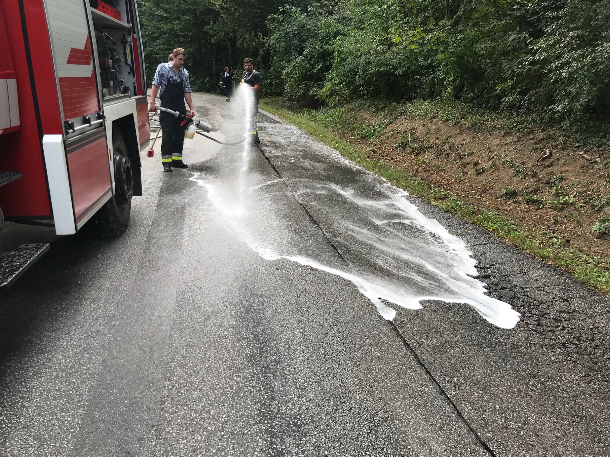 Am Einsatzort angekommen, wurde vom Einsatzleiter eine erhebliche Menge an Öl auf einer Länge von ca. 300m vorgefunden.
