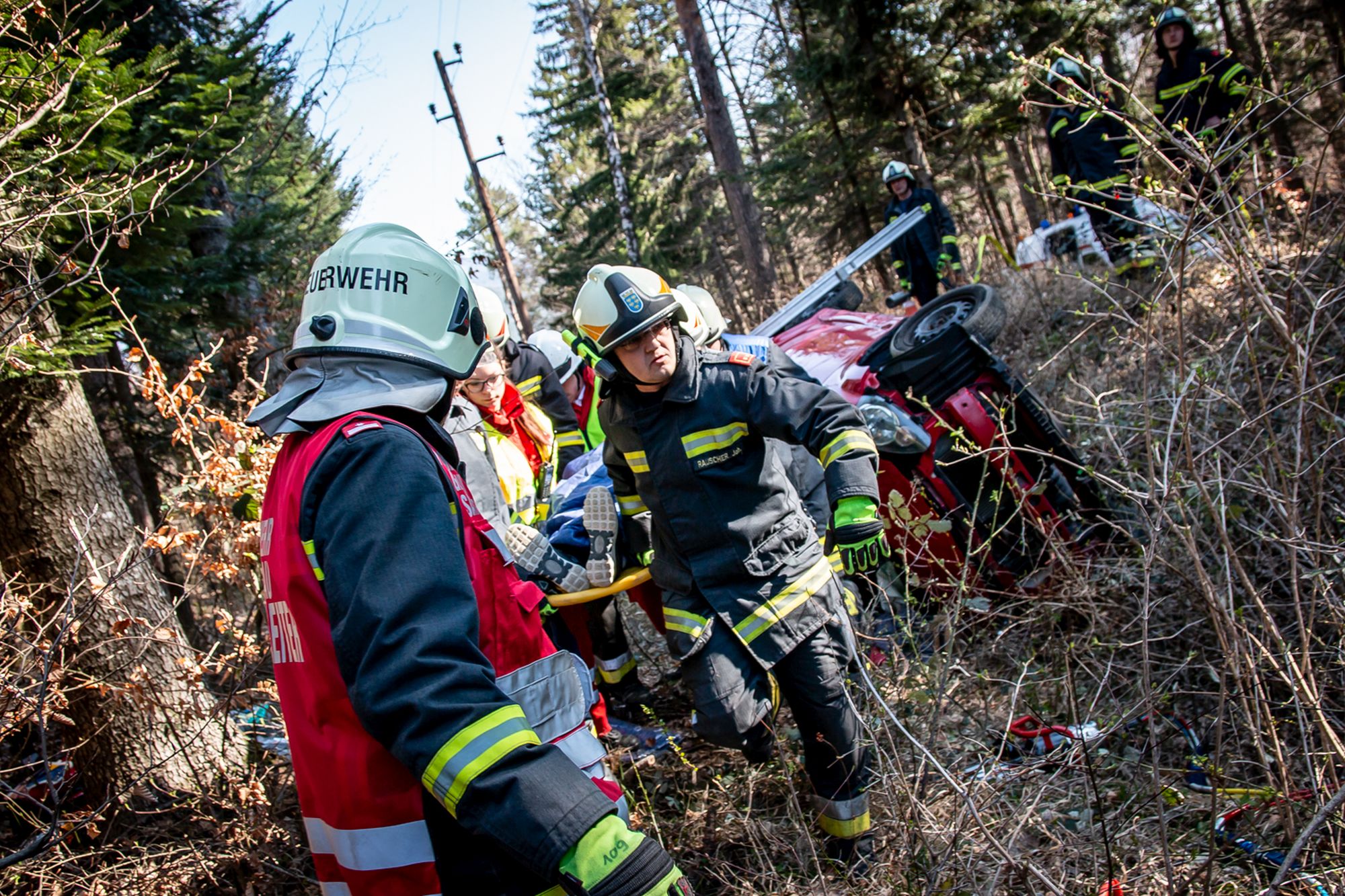 Die Übungsannahme war ein Verkehrsunfall mit einer eingeklemmten Person im PKW, sowie einer leblosen Person neben dem Fahrzeug.