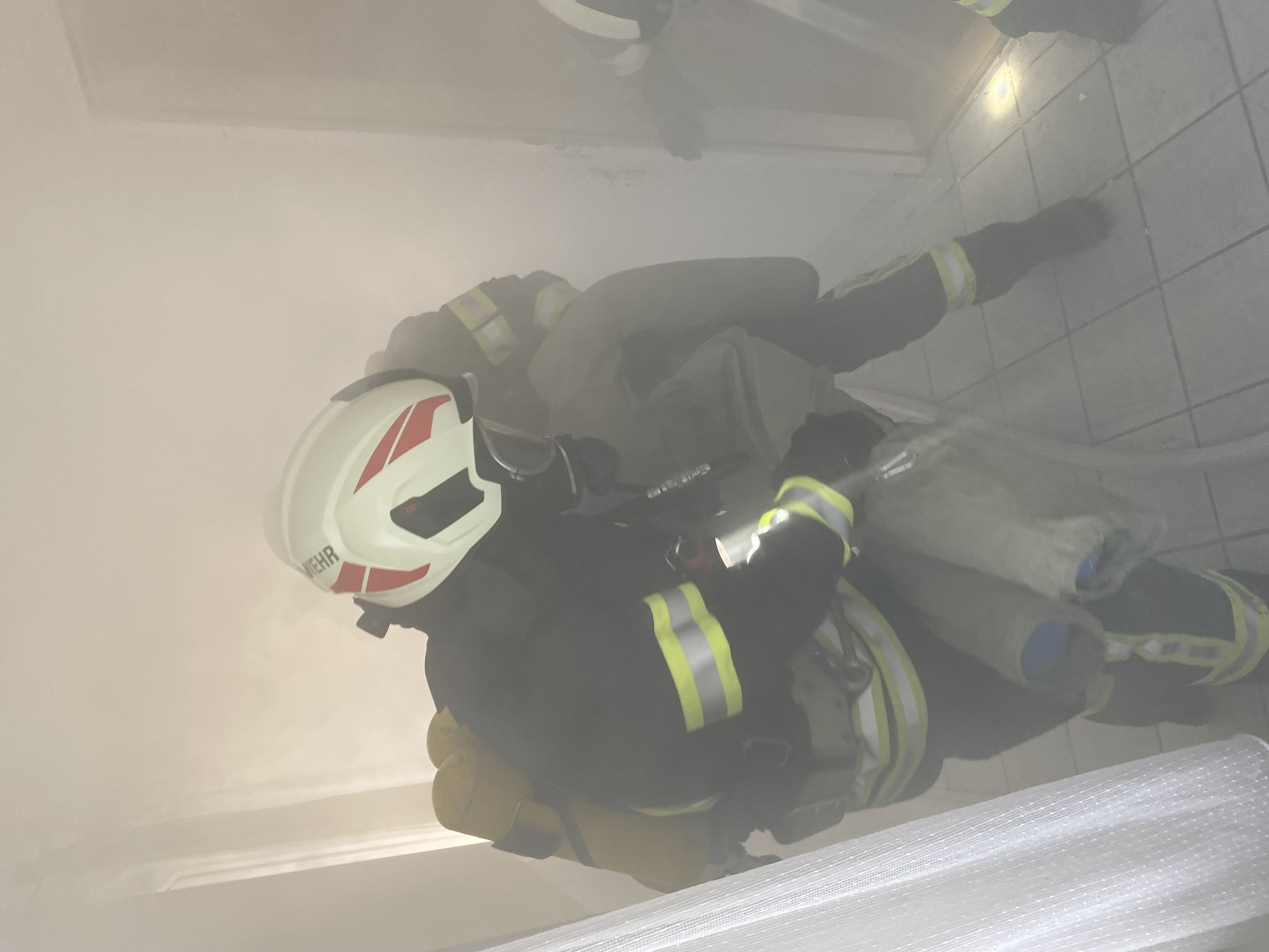 In zwei Durchgängen musste jeweils eine Übungspuppe gerettet und mittels Hydroventialtion durch das Hohlstrahlrohr die Wohnung rauchfrei gemacht werden.