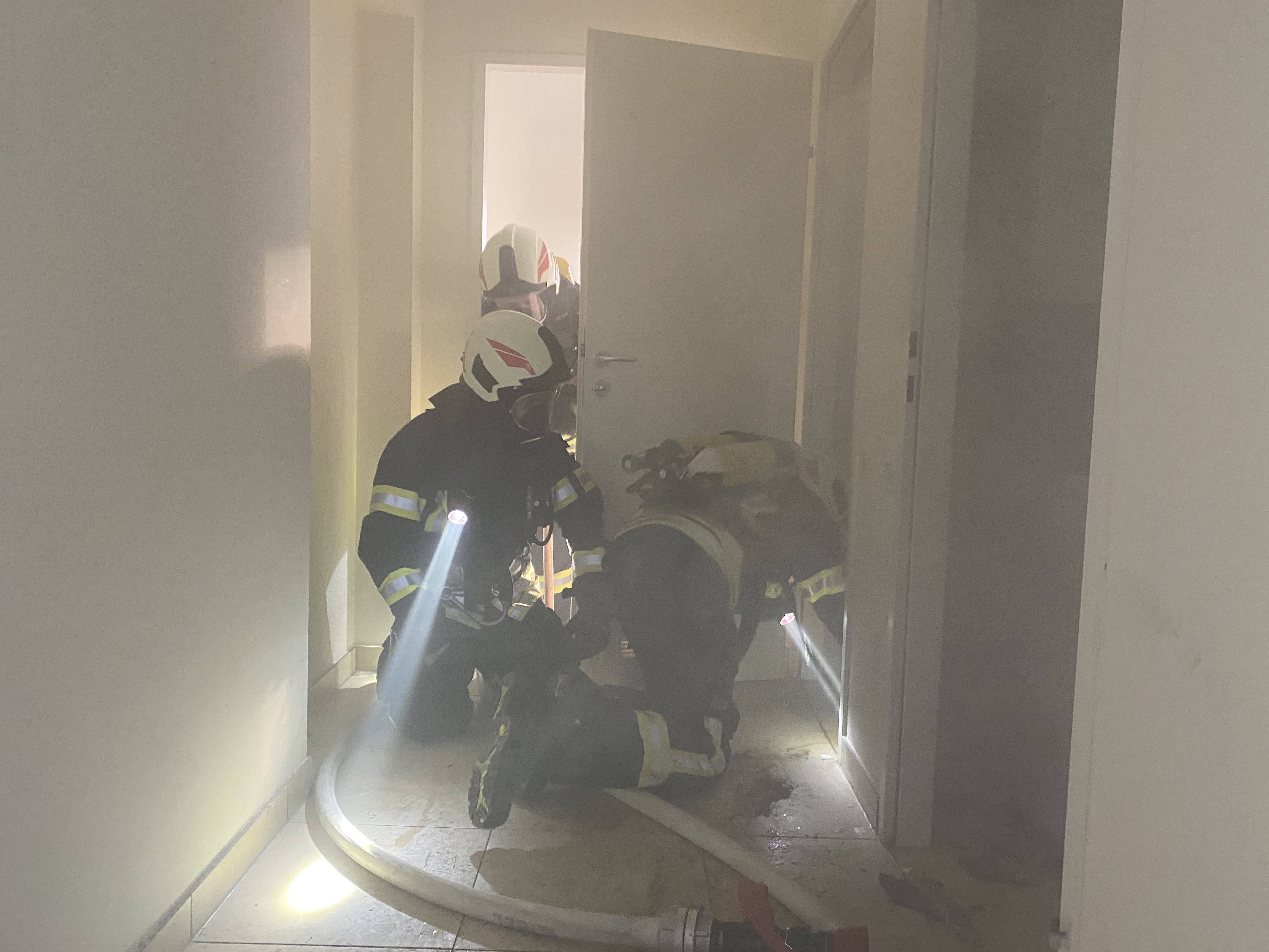 Ebenso wurde die Wohnungstüre versperrt, um das Öffnen einer Eingangstüre unter Atemschutz zu beüben.